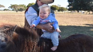 During breakfast, Cowboy arrived for our promised Grand Tour. While we were preparing to go out, he took Toby to sit on a horse called Woody. And gave him a compulsory cowboy hat to wear! We set off...